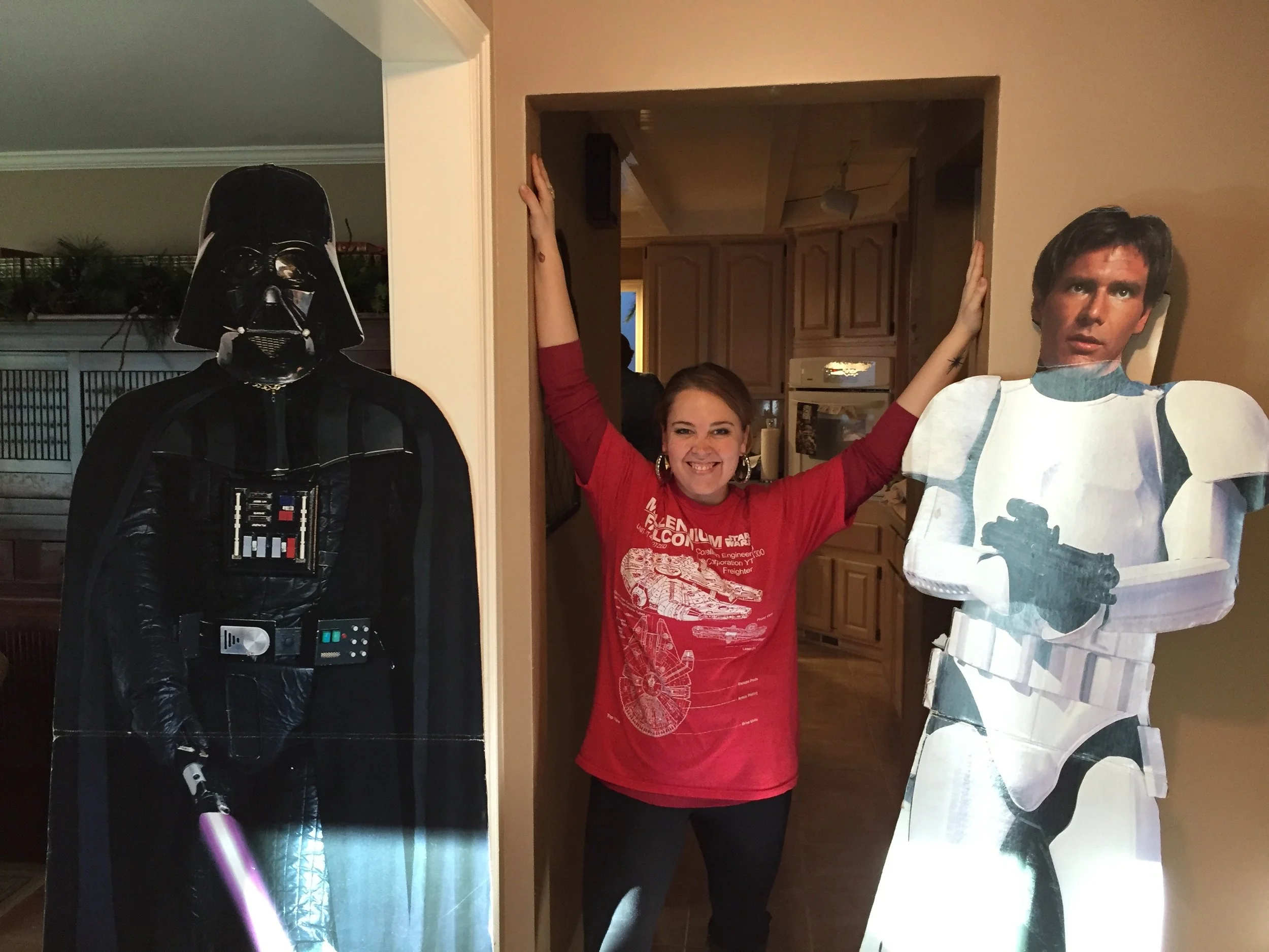 Tessa posing with Han and Vader at the family The Force Awakens party.