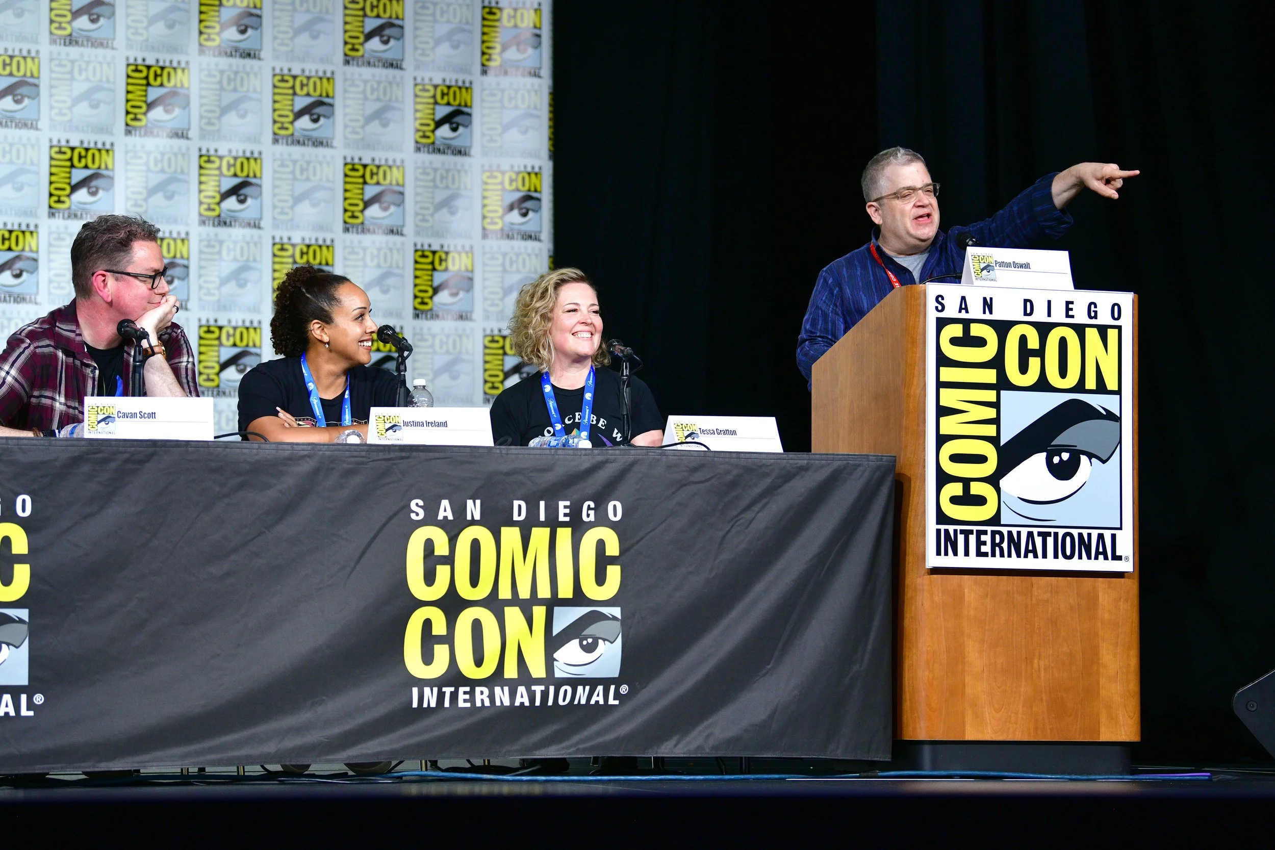Tessa on the “Stories from a Galaxy Far, Far Away” panel at San Diego Comic-Con 2024, pictured here alongside Cavan Scott and Justina Ireland, with Patton Oswalt moderating.