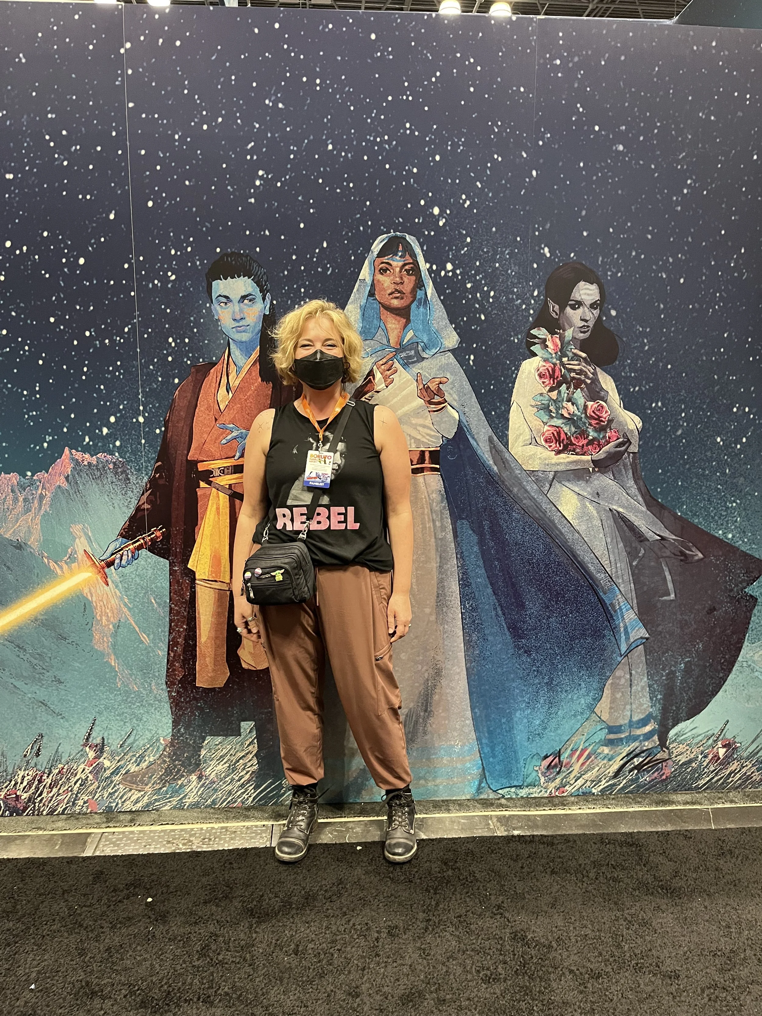 Tessa at New York Comic-Con 2022 posing in front of the cover art from Path of Deceit, co-written with Justina Ireland. Art by Corey Brickley.